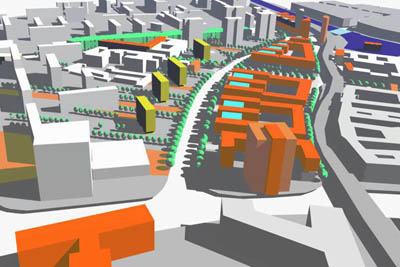 Die Straßenräume werden als Alleen ausgebildet. Als die zentrale Lunge wird der Grünplatz zur Erholung vorgesehen. Die Grünhöfe mit begehbaren Gründächern der Gewerbe- und Bürogebäude in den Höfen der Riegelbauten bilden das Kleinklima und dienen den Nutzern.